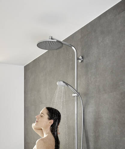 Jato de chuveiro versátil para uso diário. A chuva mima com gotas cheias, leves e ricas. O jato total de água é ideal para lavar os cabelos e enxaguar o shampoo.